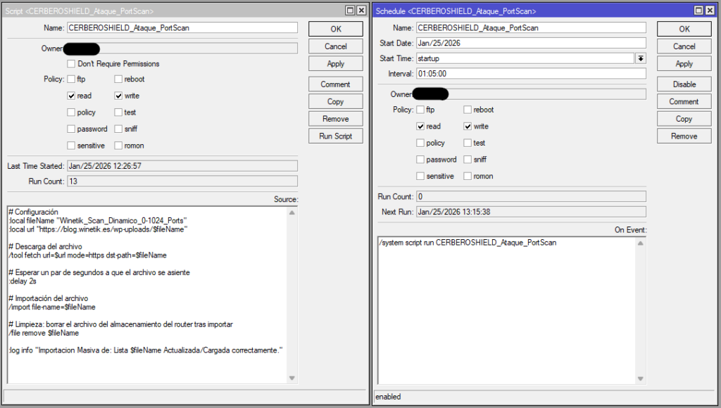 Genera en el equipo Mikrotik un script nuevo que contenga el siguiente código: FICHERO